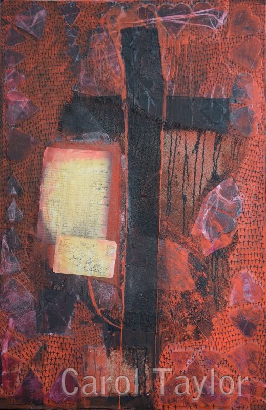 Italian Linen on wooden panel, Hessian sack cloth, red sealing wax, earth pigments from France, rabbit skin glue, Acrylic paint, WW1 Hospital admission records and WW1 postcard addressed to my Grandpa Lance Corporal John James Taylor, in France; 9th Royal Fusiliers Expeditionary Force, collaged into the painting and a small pair red velvet baby shoes. Cardboard hearts with hidden messages are collaged into the painting, each one to represent a member of my Taylor family. The tiny black crosses represent the unknown fallen soldiers.