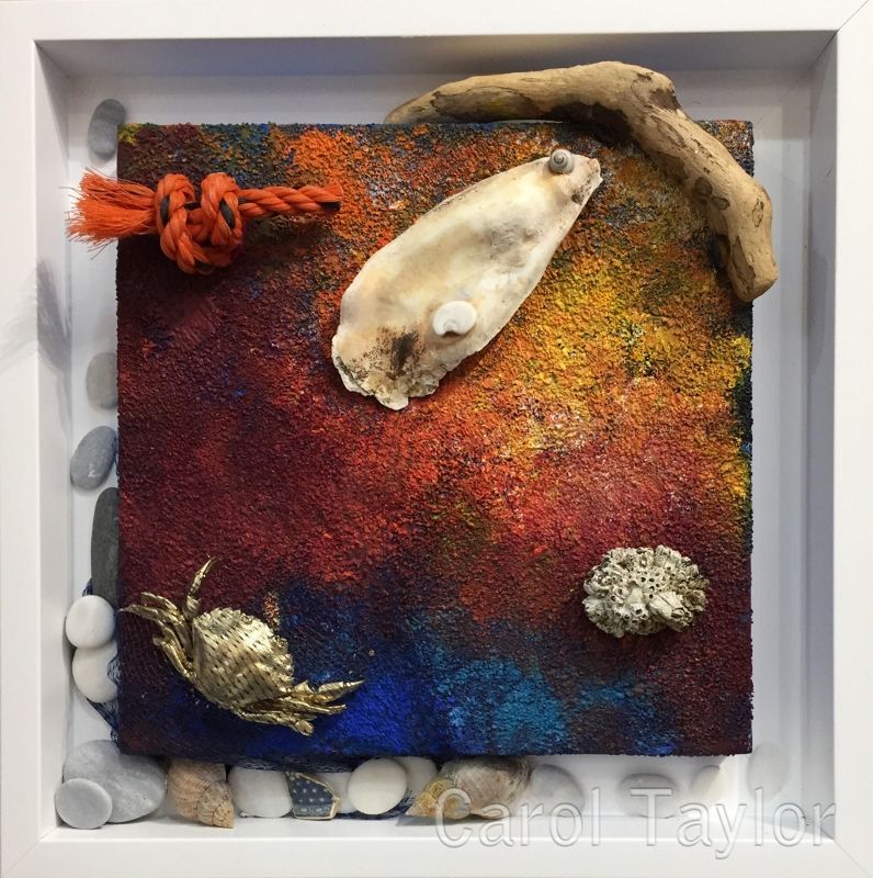 Acrylic paint, stretched canvas, beach combing objects and the wee crab.